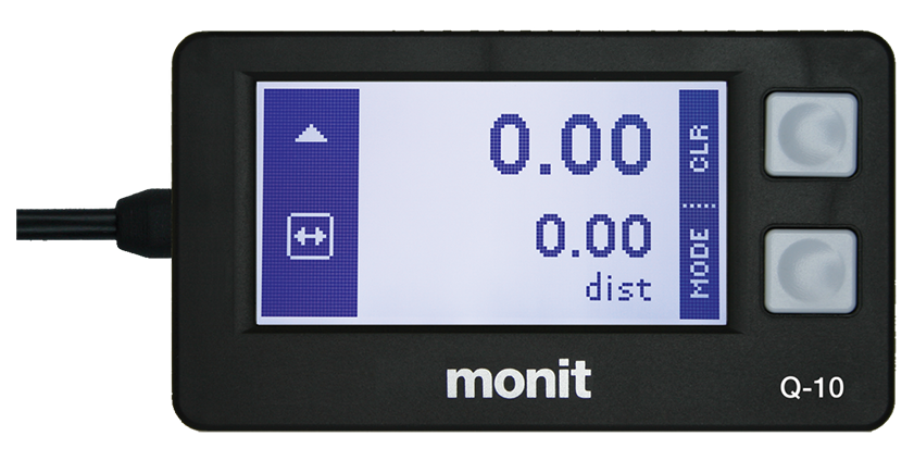 The Monit Q-Series is fitted with two five-digit distance counters that can be quickly set to zero or adjusted up and down using the simple menu system. The counting direction (up or down) can be changed, and the decimal point automatically shifts to allow measurement of very large distances. An external hand or foot-switch can be connected to clear the distances, change the counting direction, or implement a freeze function.